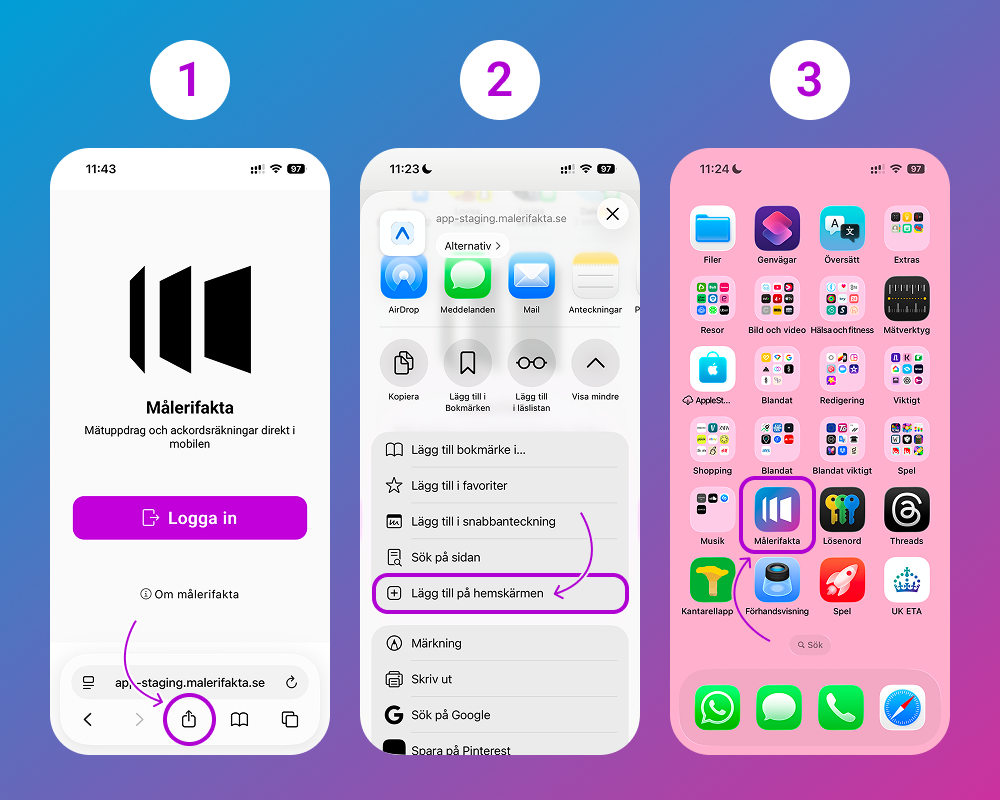 Kundportalen nås via en länk till Målerifaktas webbapplikation. Om du använder mobil öppnas tjänsten i webbläsaren och kan därefter läggas till på hemskärmen för snabb och enkel åtkomst. På dator används kundportalen direkt i webbläsaren som en vanlig webbsida.