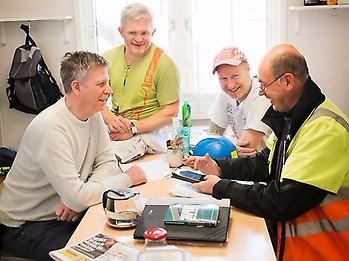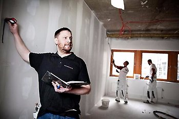 Målerifaktas mätare Torbjörn Edsbrand i samspråk med målarna Krister Lundin och Göran Stark samt projektledare Per Norrman från Timblads måleri i Stockholm.